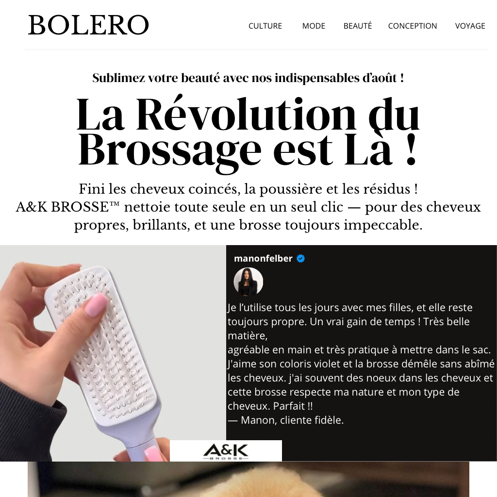 A&K Brossese distingue par son design ergonomique et de sa technologie de nettoyage optimisée. Que vos cheveux soient bouclés, lisses, épais, fins, crépus ou traités, notre brosse a été testée sur une grande variété de textures. Les picots flexibles assurent un brossage en douceur et sans casse. Et pour un nettoyage sans effort.